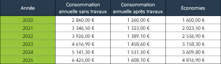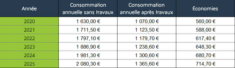On constate donc que 6 ans après les travaux, les économies annuelles ne sont plus de 560€ comme initialement mais de 714€.