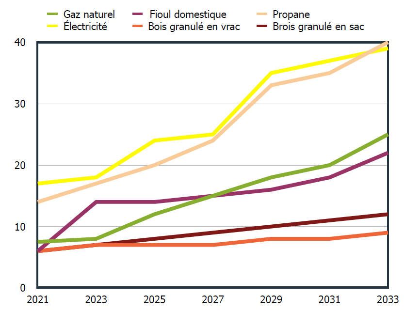 En prenant un scénario d’augmentation de 5% par an pour l’électricité et le gaz naturel, cela nous donne l’évolution ci-dessous :