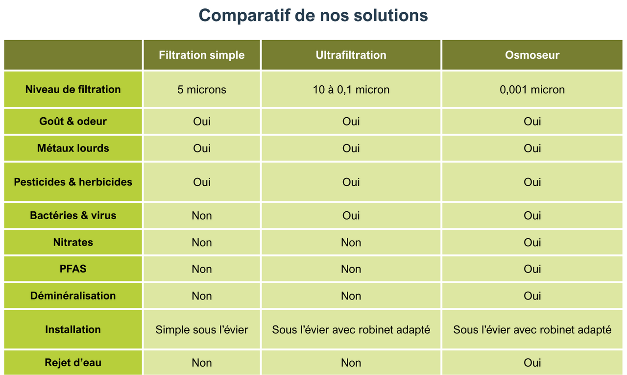 Soucieux de proposer des solutions adaptées à tous vos besoins et vous permettre de consommer une eau saine chaque jour, nous proposons aujourd’hui 3 produits pour 3 niveaux de filtration différents.