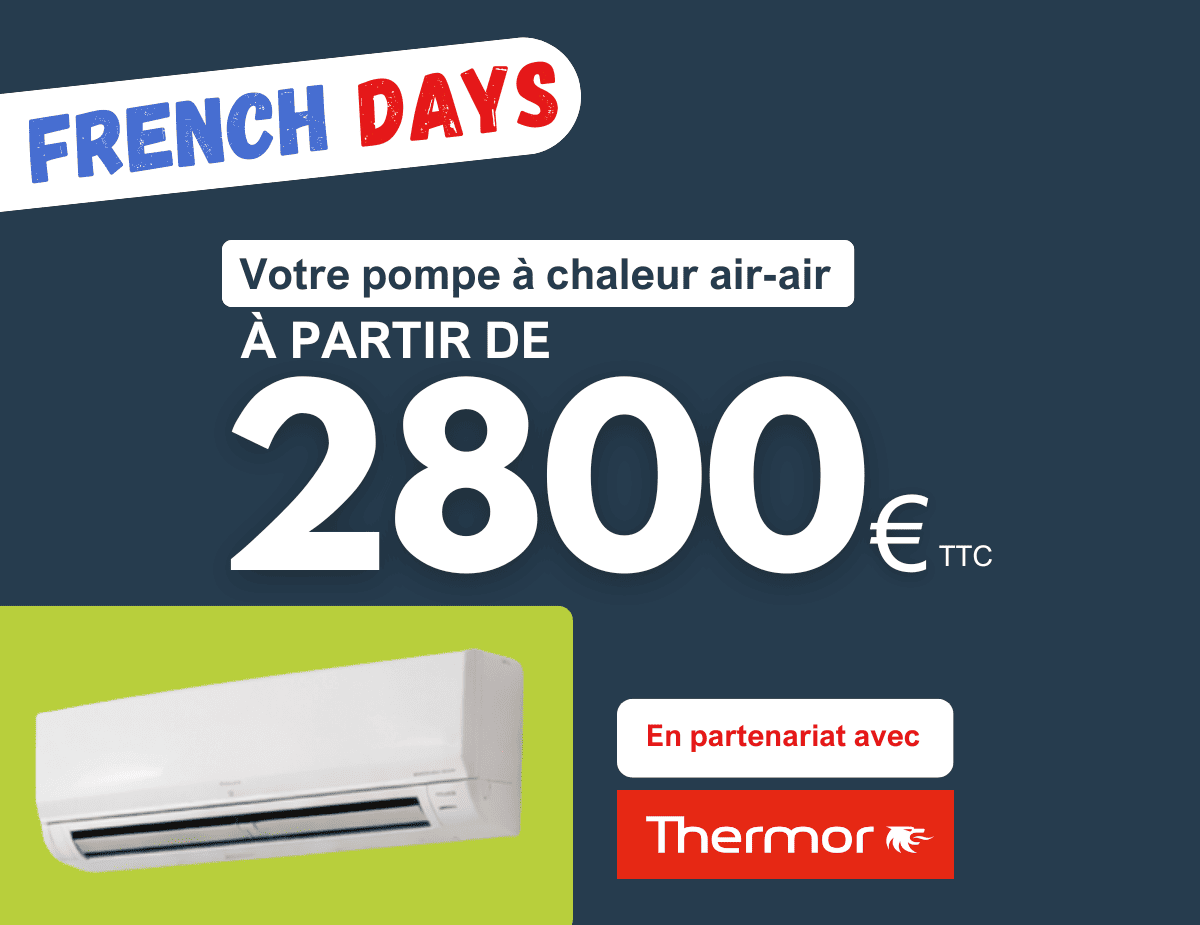 Découvrez cette solution polyvalente qui va vous permettre d'améliorer votre confort thermique été comme hiver grâce à sa réversibilité ! Profitez de notre offre spéciale French Days pour installer une pompe à chaleur air-air qui va vous permettre de gagner en confort toute l'année tout en réduisant votre facture d'énergie. Investissez dès maintenant pour réduire votre impact environnemental tout en faisant des économies.